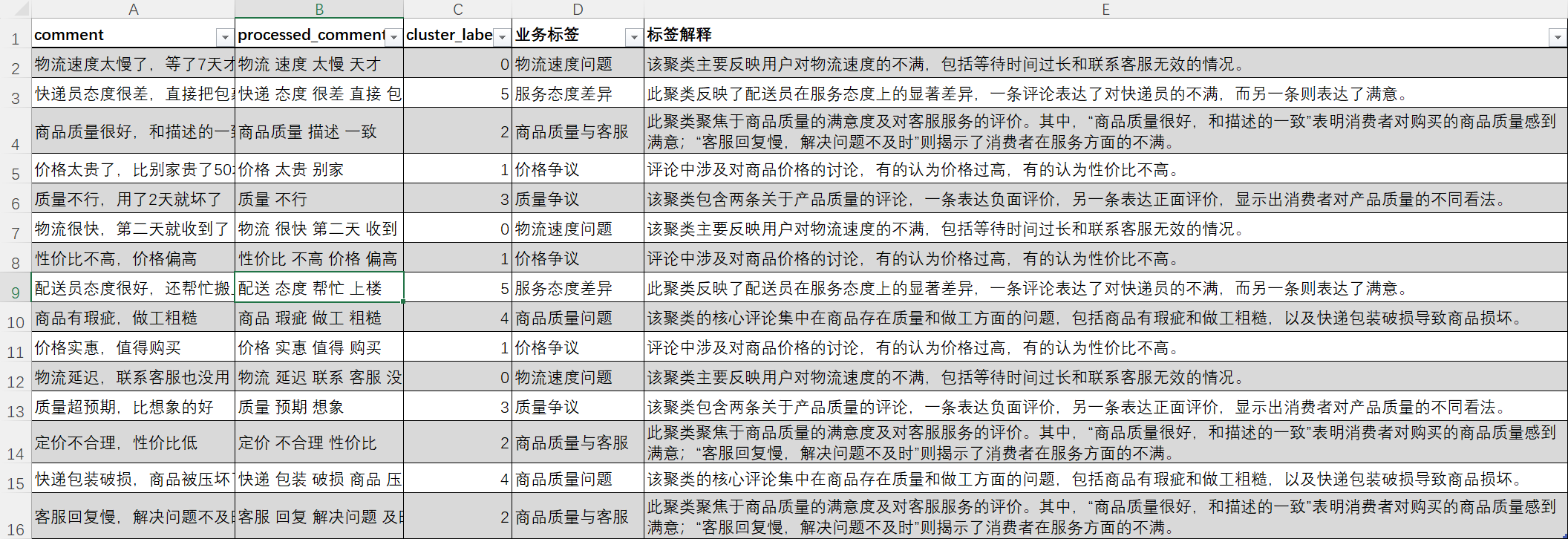 像超市的资深导购,看到每个货架的商品后,给货架贴清晰的标签,还能说明这个货架的核心特征;在聚类后每个“货架”(聚类簇)里堆满了相似内容,但还没有名字和说明,这时,大模型这位“资深导购”开始进行分析和说明,比如“该类评论主要抱怨商品定价过高,对比竞品性价比低”: