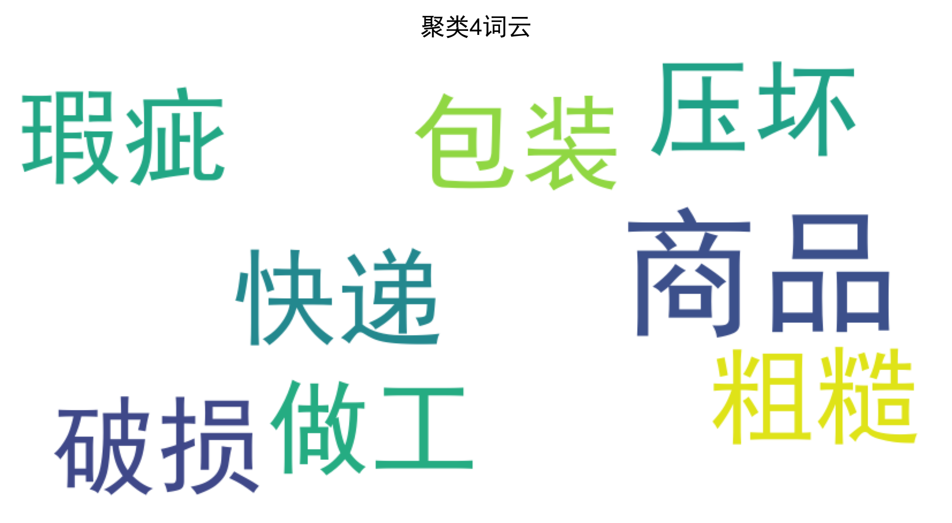=== 聚类4 === 标签:商品质量问题 解释:该聚类的核心评论集中在商品存在质量和做工方面的问题,包括商品有瑕疵和做工粗糙,以及快递包装破损导致商品损坏。 示例评论:['商品有瑕疵,做工粗糙', '快递包装破损,商品被压坏了'] 最终结果已保存到cluster_result.csv