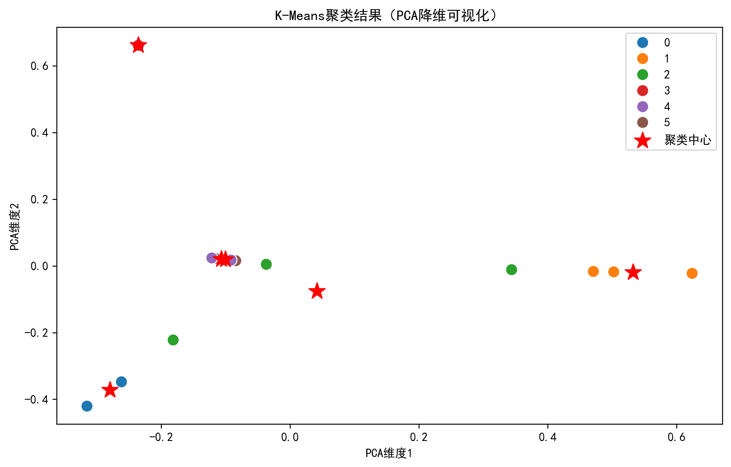 原始数据: comment 0 物流速度太慢了,等了7天才到 1 快递员态度很差,直接把包裹放门口 2 商品质量很好,和描述的一致 3 价格太贵了,比别家贵了50块 4 质量不行,用了2天就坏了 5 物流很快,第二天就收到了 6 性价比不高,价格偏高 7 配送员态度很好,还帮忙搬上楼 8 商品有瑕疵,做工粗糙 9 价格实惠,值得购买 10 物流延迟,联系客服也没用 11 质量超预期,比想象的好 12 定价不合理,性价比低 13 快递包装破损,商品被压坏了 14 客服回复慢,解决问题不及时 Building prefix dict from the default dictionary ... Loading model from cache C:\Users\admin\AppData\Local\Temp\jieba.cache Loading model cost 0.354 seconds. Prefix dict has been built successfully. 预处理后数据: comment processed_comment 0 物流速度太慢了,等了7天才到 物流 速度 太慢 天才 1 快递员态度很差,直接把包裹放门口 快递 态度 很差 直接 包裹 门口 2 商品质量很好,和描述的一致 商品质量 描述 一致 3 价格太贵了,比别家贵了50块 价格 太贵 别家 4 质量不行,用了2天就坏了 质量 不行 5 物流很快,第二天就收到了 物流 很快 第二天 收到 6 性价比不高,价格偏高 性价比 不高 价格 偏高 7 配送员态度很好,还帮忙搬上楼 配送 态度 帮忙 上楼 8 商品有瑕疵,做工粗糙 商品 瑕疵 做工 粗糙 9 价格实惠,值得购买 价格 实惠 值得 购买 10 物流延迟,联系客服也没用 物流 延迟 联系 客服 没用 11 质量超预期,比想象的好 质量 预期 想象 12 定价不合理,性价比低 定价 不合理 性价比 13 快递包装破损,商品被压坏了 快递 包装 破损 商品 压坏 14 客服回复慢,解决问题不及时 客服 回复 解决问题 及时 最优 K 值输出: K=2,轮廓系数=0.0244 K=3,轮廓系数=0.0372 K=4,轮廓系数=0.0603 K=5,轮廓系数=0.0613 K=6,轮廓系数=0.0711 最优聚类数K=6