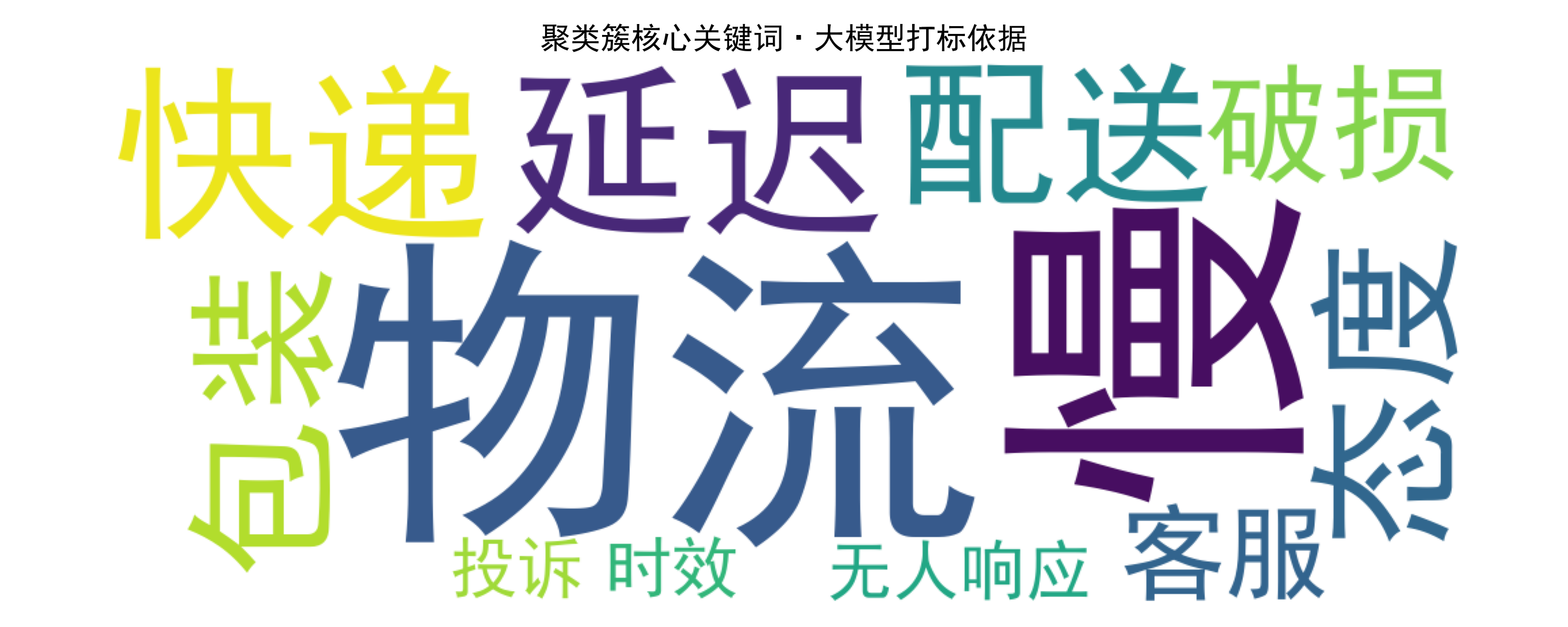 === LDA主题模型结果 === 主题1核心词:性价比, 定价, 不合理, 偏高, 不高, 速度, 太慢, 天才, 压坏, 破损 主题2核心词:购买, 实惠, 值得, 门口, 很差, 包裹, 直接, 价格, 快递, 态度 主题3核心词:物流, 一致, 商品质量, 描述, 很快, 第二天, 收到, 联系, 没用, 延迟 主题4核心词:不行, 质量, 回复, 解决问题, 及时, 客服, 价格, 商品, 物流, 快递 主题5核心词:配送, 帮忙, 上楼, 态度, 价格, 质量, 商品, 物流, 快递, 客服 主题6核心词:别家, 太贵, 预期, 想象, 质量, 做工, 瑕疵, 粗糙, 价格, 商品 === 聚类0 === 标签:物流速度问题 解释:该聚类主要反映用户对物流速度的不满,包括等待时间过长和联系客服无效的情况。 示例评论:['物流速度太慢了,等了7天才到', '物流很快,第二天就收到了', '物流延迟,联系客服也没用']