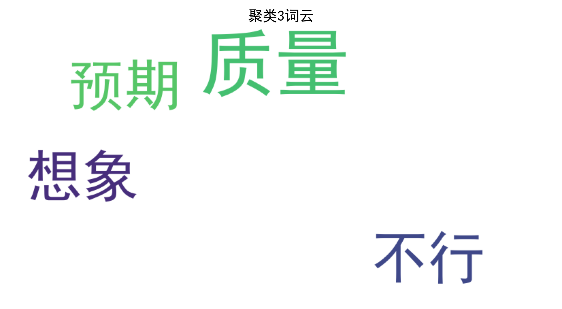 === 聚类3 === 标签:质量争议 解释:该聚类包含两条关于产品质量的评论,一条表达负面评价,另一条表达正面评价,显示出消费者对产品质量的不同看法。 示例评论:['质量不行,用了2天就坏了', '质量超预期,比想象的好']