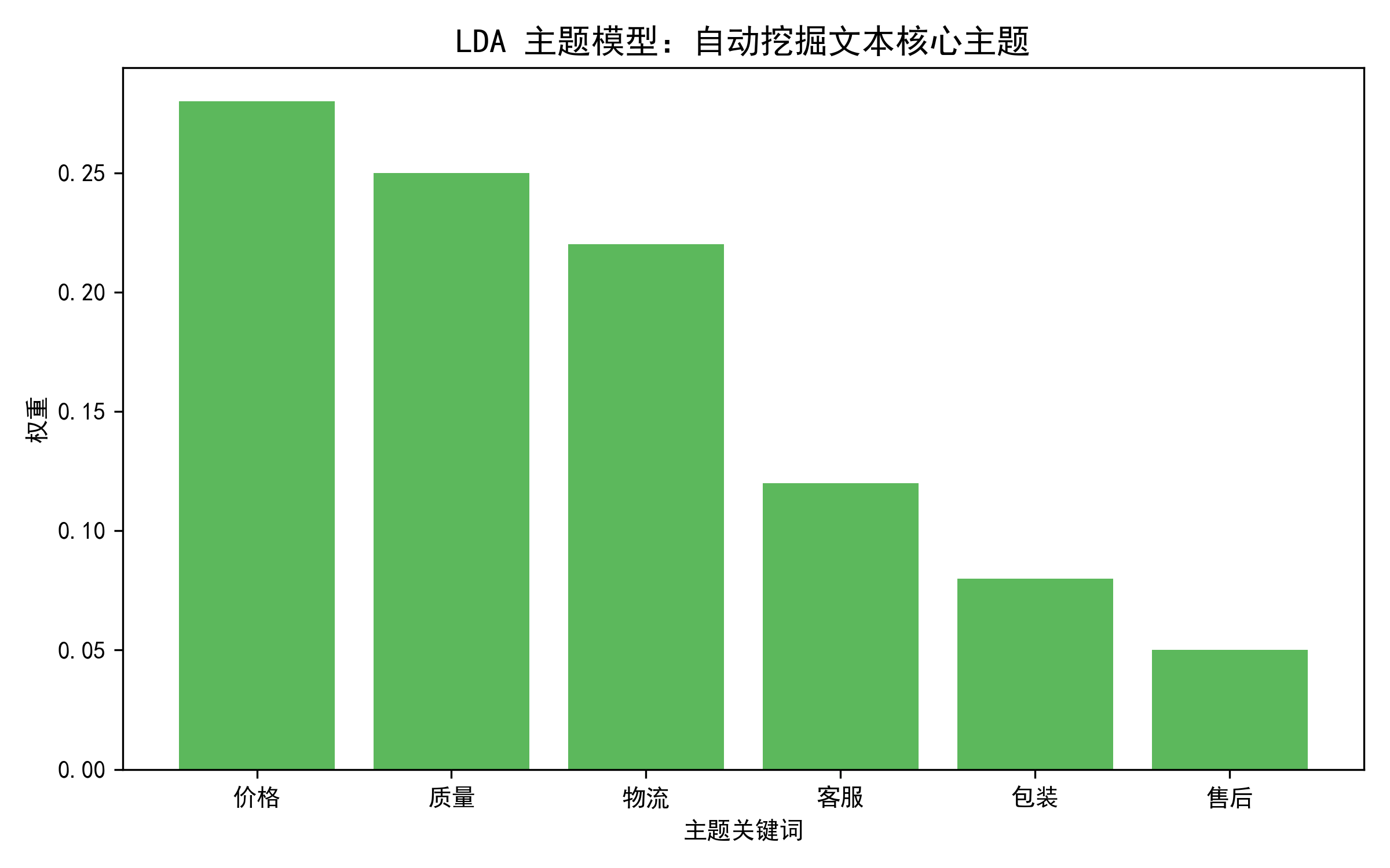 LDA就像挖掘主题的语义侦探, 不是看距离,而是从文本中自动发现潜在的主题结构。它认为每篇文档都是多个主题的混合,比如60%是“价格”,40%是“服务”,属于“软聚类”或“概率聚类”。