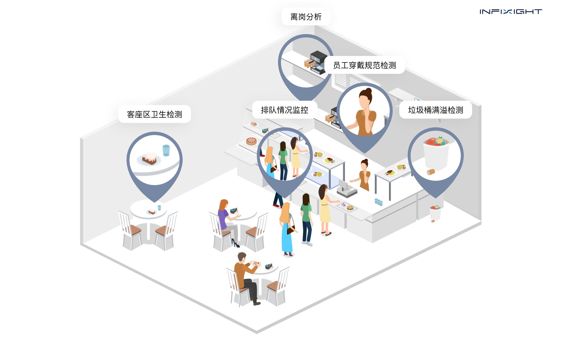 通过部署在门店内的摄像头采集实时画面,结合 AI 视觉算法,对食安合规、服务规范、陈列标准、安全防控等核心运营场景进行 7×24 小时持续分析。