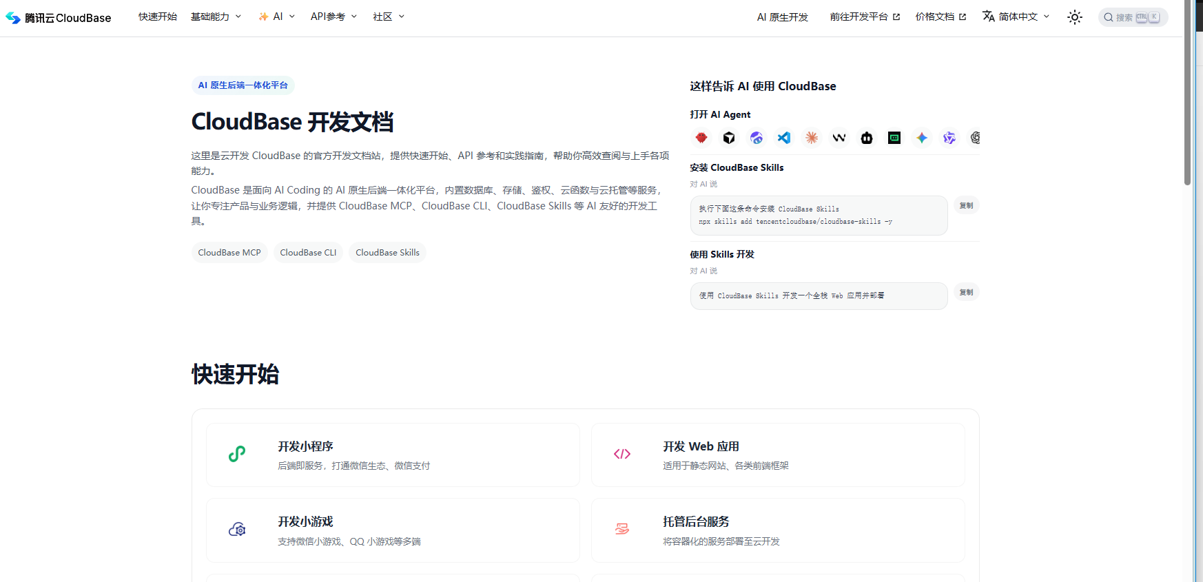 友友们,早上好。对于我们开发者来说,处在 AI 原生开发时代,让 AI 助手懂规范、会落地、能上云,是提升全栈开发效率的关键。最近我发现了腾讯云开发 CloudBase 推出的 AI Skills 技能包,搭配 MCP 协议能力,可将云开发专业流程注入 AI 编程工具,解决 AI 写代码 不贴合生产规范、无法直接对接云资源的问题,帮助我们实现从自然语言需求到云端部署的需求。今天我就分享一下我关于CloudBase AI Skills 的安装配置、激活优化与实战用法的一些心得,希望对大家有所帮助。