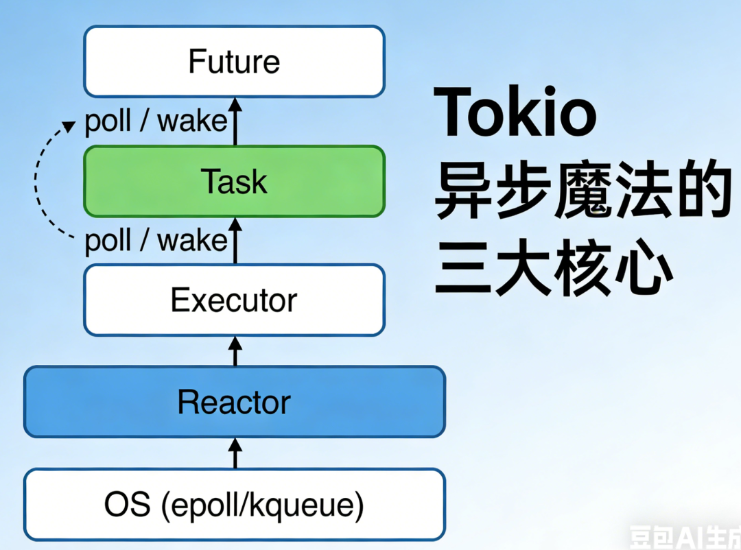 tokio::spawn → 创建 Task(包裹 Future)Future::pollPending → 注册 Waker 到 Reactorwake()整个过程无线程阻塞、无上下文切换,并发能力爆炸。