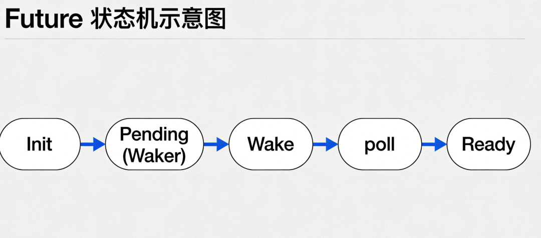 }poll,状态机就从当前状态往前走一步,直到返回 Ready。关键点:Future 本身不会自动执行,必须有人反复调用 poll 才能前进。这就是 Runtime 的工作。