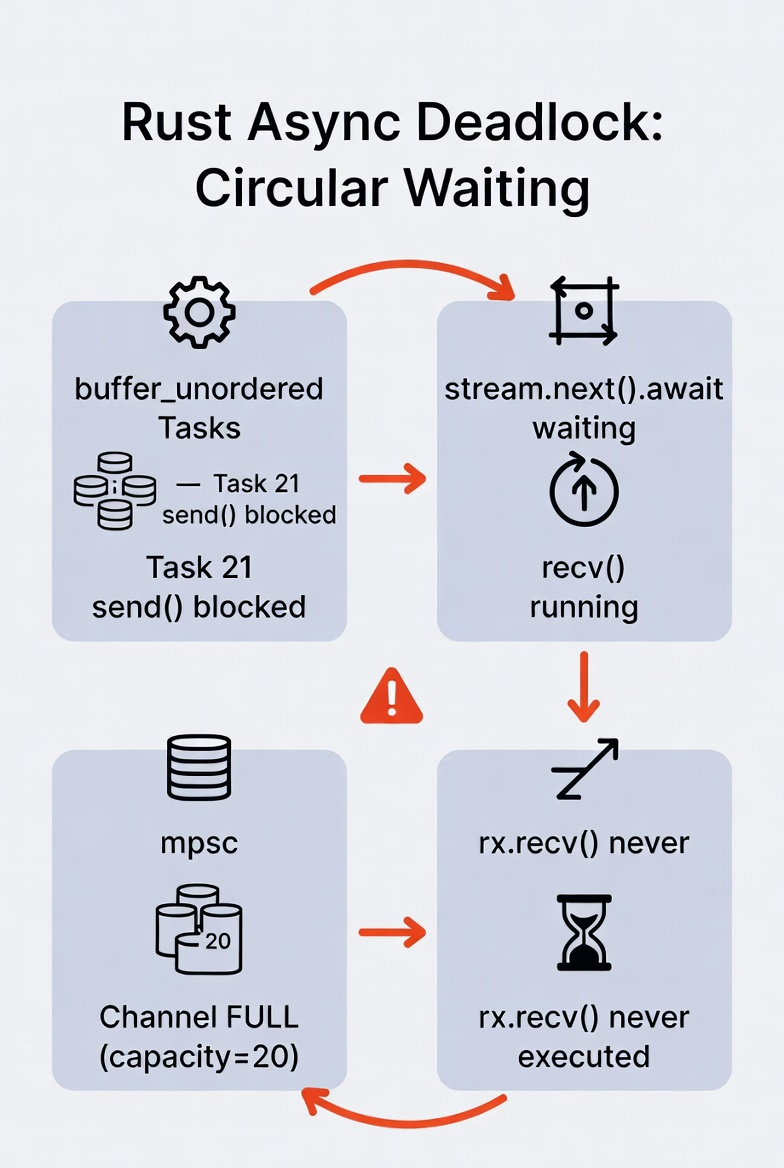 buffer_unordered(20) 同时运行 20 个任务。send() 开始等待空间释放。stream.next().await 上等待“下一个任务完成”。send() 成功,而 send() 依赖主线程去 recv() —— 却永远轮不到。结果:send() 等 recv(),stream.next() 等任务完成,recv() 又在 stream 循环之后,三方互相卡死,形成经典死锁环。