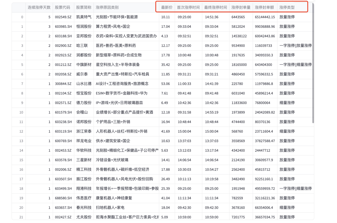 上面的这个例子改动是应星球的同学反馈,在原来涨停代码基础上增加的几个字段,方便查看连板的个股细节。 首次涨停时间、最终涨停时间、 涨停封单量、涨停封单额、 涨停类型等。