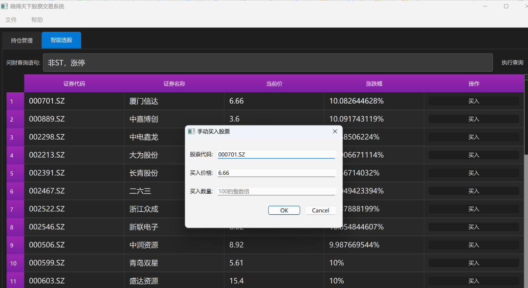 3、问财查询,先手工进行交易。 这部分准备后续完善下,比如多种交易模式。