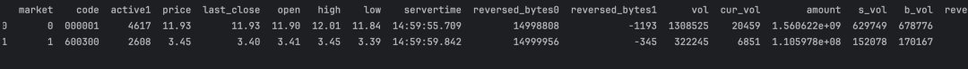 print(client.quotes(symbol=["000001", "600300"]))运行结果: