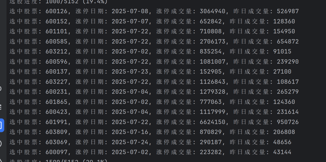 f"选中股票: {code}, 涨停日期: {last_limit_up['date']}, 涨停成交量: {last_limit_up['volume']}, 昨日成交量: {last_day_data['volume']}")