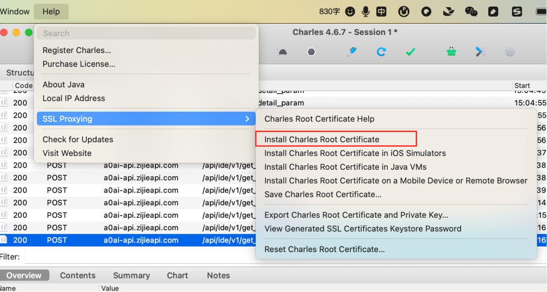 代理配置成功后,网络请求出现在Charles主界面 。需要注意一下, 网络抓包的时候可能需要关闭 电脑里的其他代理软件,比如v2rayU什么的。