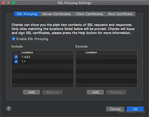 找到 Proxy - SSL Proxying Settings,点击 Add,Host填*,Port填*或者443。两个都填也行。
