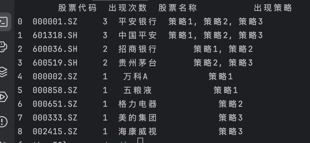 先说下技术思路,其实就是对pandas基础的快速应用, 把多个策略的个股统计出现次数,至少从明面上来看 策略出现的次数越多,说明共振的几率越大。