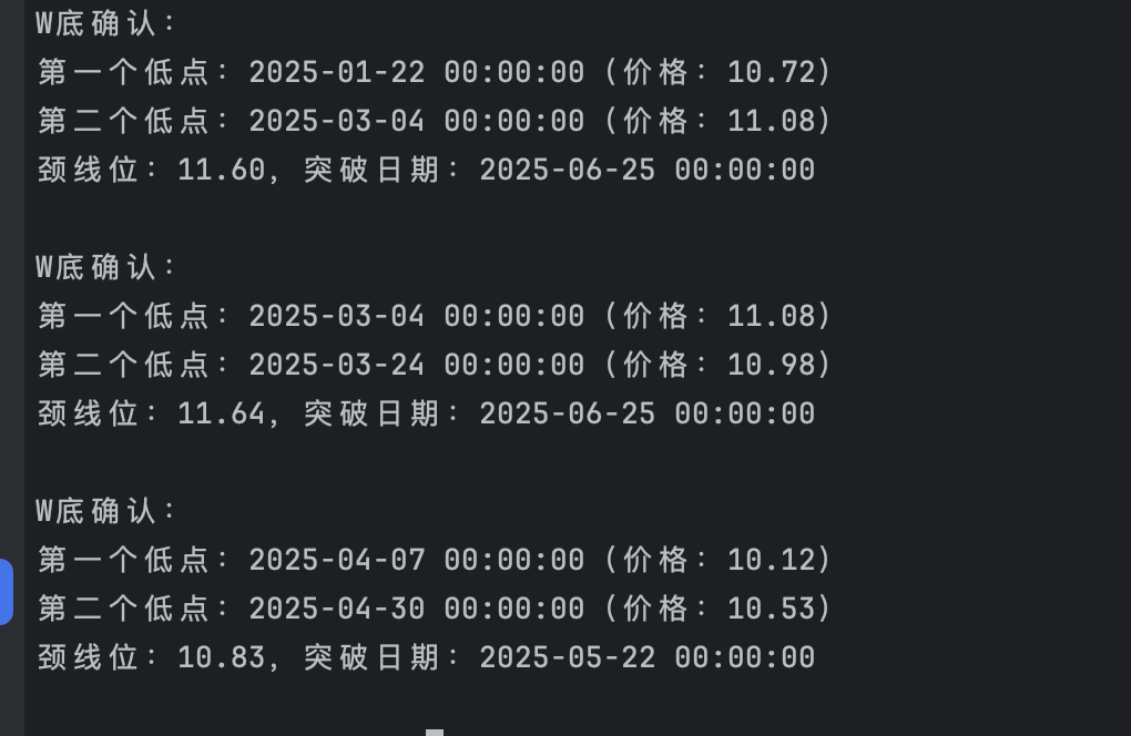 print(f"共识别出{len(bottom_signals)}个底分型信号,日期:{bottom_signals.index.strftime('%Y-%m-%d').tolist()}")双重底,俗称“W底”,由两个低点和中间一个反弹高点构成,形似字母“W”。其核心特征: