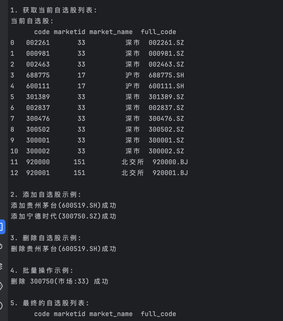 我们可以通过这个例子完成哪些事情呢,假设你有1套策略, 执行最终的结果后你 想回写进自己的自选股,那么我们就可以用这种方式实现。