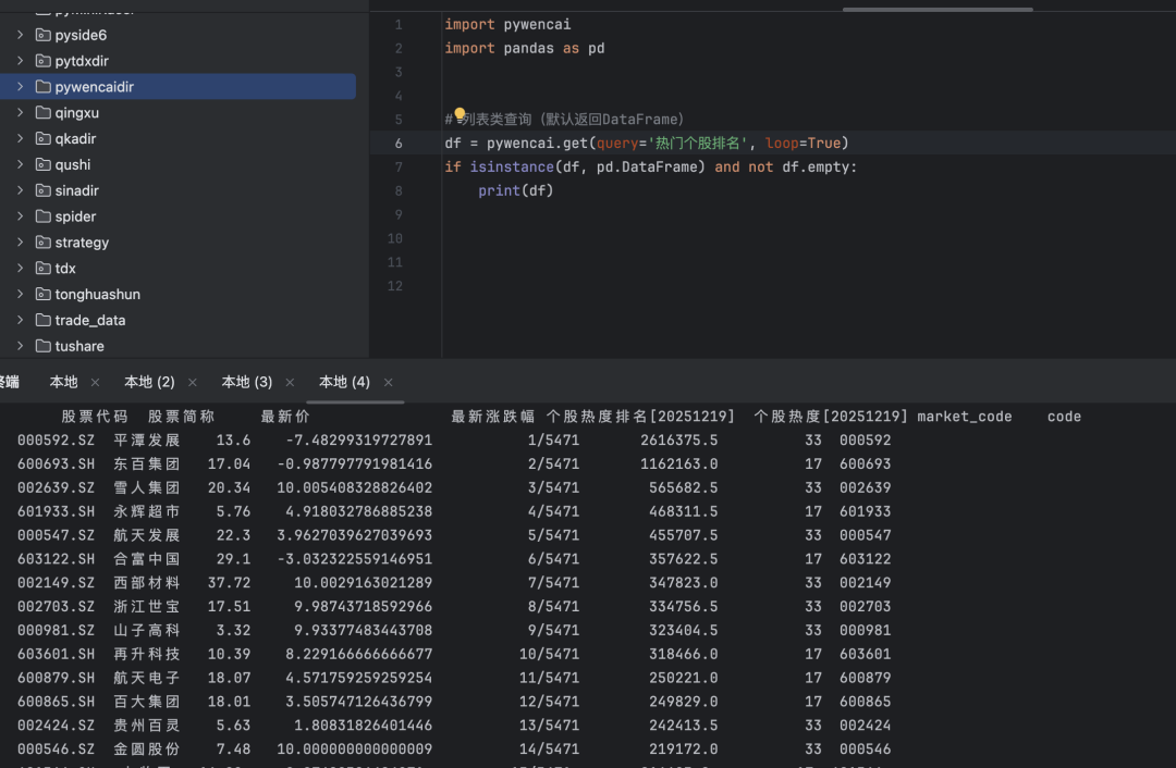 pywencai是一个非官方的开源Python库,它能够模拟浏览器行为,直接调用同花顺“问财”的后台接口,将我们用中文输入的查询条件(如“热门个股排名”)转换为结构化的数据,并返回为便于分析的pandas.DataFrame格式。