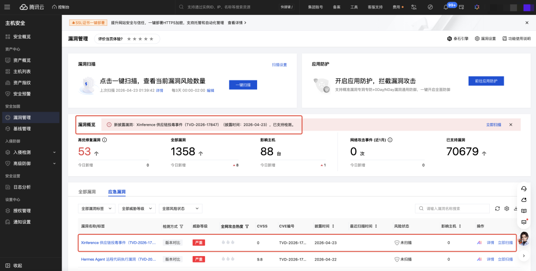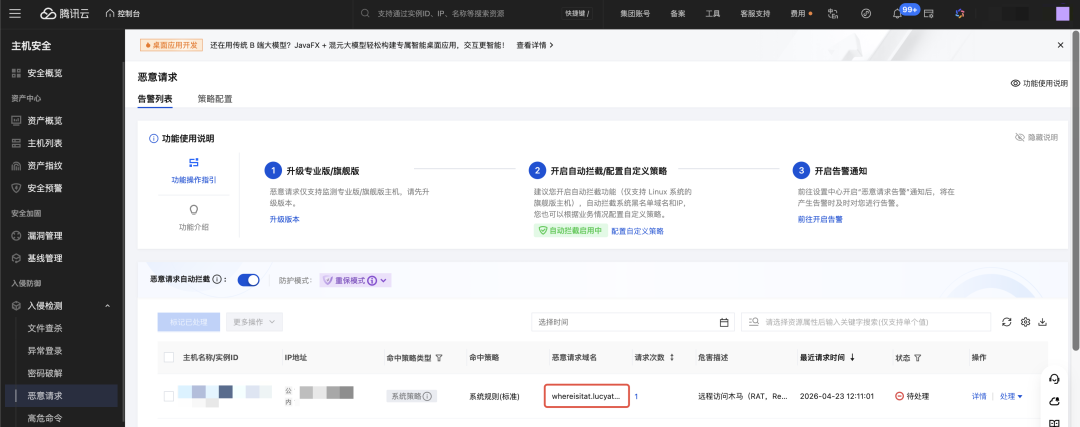 腾讯云主机安全与云防火墙已于事件公开后第一时间完成检测规则、IOC 与恶意域名情报策略更新,支持客户对受影响资产进行快速定位、风险处置及持续防护。