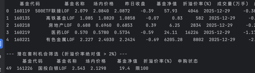 print(target_df[['基金代码', '基金名称', '场内价格', '基金净值', '折溢价率(%)', '申购状态']])