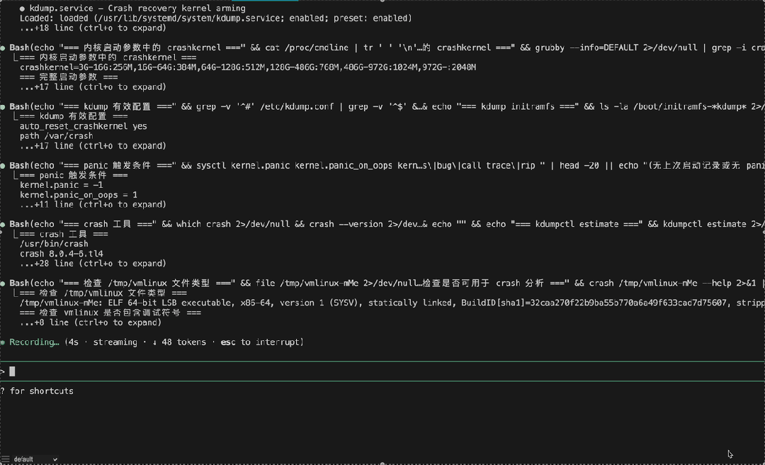 自动检查 kdump 配置、panic 参数和磁盘空间,输出完整分析方案和修复建议。