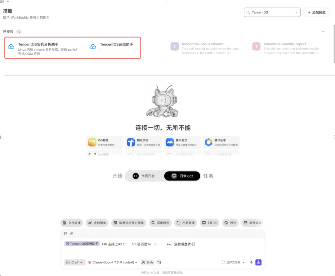 1、在本地下载安装 WorkBuddy; 2、在WorkBuddy技能市场安装两大技能 :TencentOS宕机分析助手、TencentOS运维助手 3、用本地WorkBuddy使用自然语言运维远程服务器;