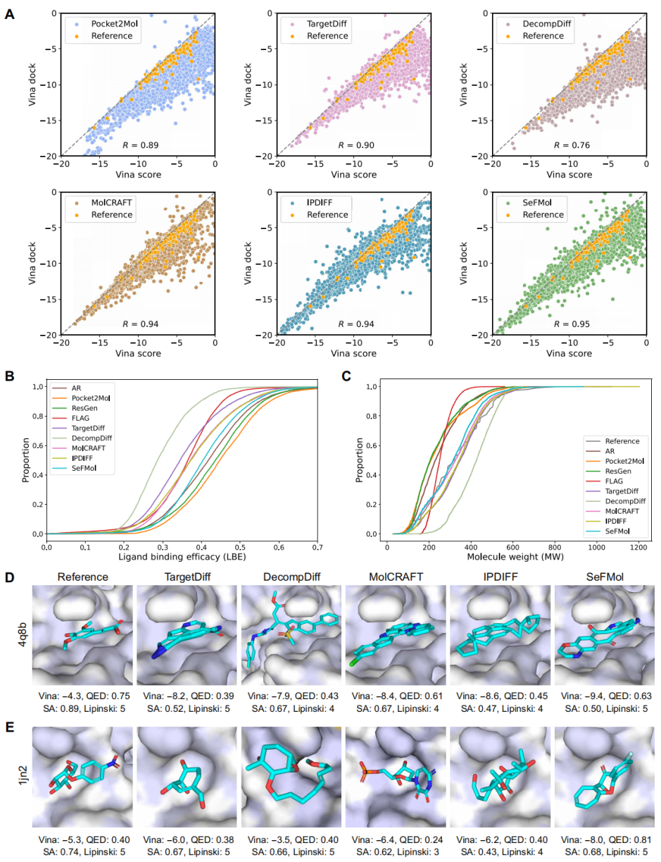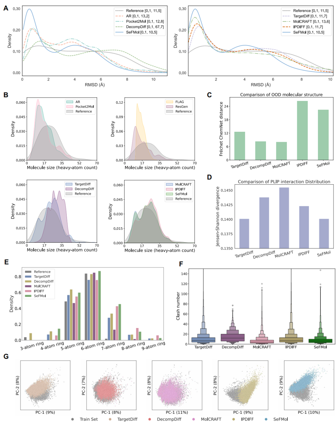 图4. SeFMol 在构象可靠性、相互作用模式合理与结构新颖性方面的表现。