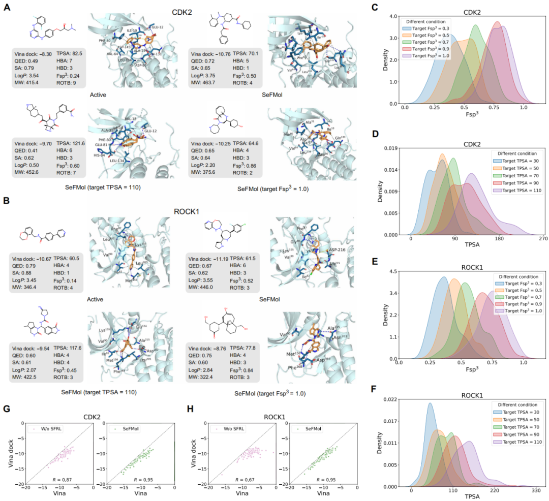 该研究进一步将 SeFMol 应用于两个真实治疗相关靶点:CDK2 和 ROCK1。结果显示,SeFMol 为这两个靶点生成的候选分子整体具有更优的表现,并且既能够复现已知活性分子的经典结合模式,也能够探索出新的合理相互作用。这表明 SeFMol 不仅适用于标准 benchmark 场景,也具备一定的真实靶点定制化设计能力。该研究还进一步测试了 SeFMol 的性质可控性,即在保持其他条件不变的情况下,指定不同的 TPSA 或 Fsp³ 目标值进行生成。结果表明,模型生成分子的性质分布依然能够围绕给定目标值变化,说明其在真实靶点条件下同样具备较好的响应能力。进一步地,该研究还将 SeFMol 应用于 AlphaFold 预测蛋白结构,发现模型同样能够生成具有较优结合表现的候选分子。这提示 SeFMol 并不局限于高质量晶体结构,也有望适用于更广泛的现实药物发现任务。