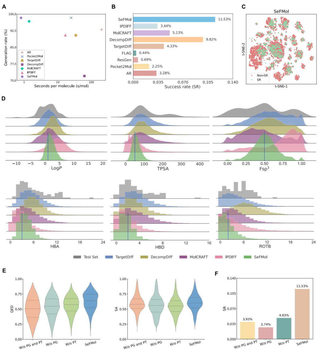 图3. SeFMol 在采样效率、成功率以及理化性质控制方面的表现。