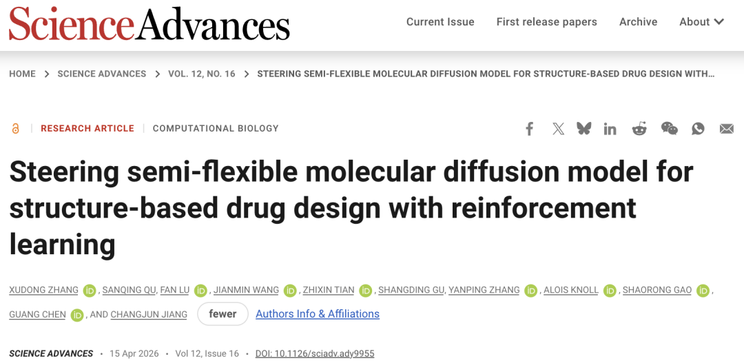 Xudong Zhang et al. ,Steering semi-flexible molecular diffusion model for structure-based drug design with reinforcement learning.Sci. Adv.12,eady9955(2026).