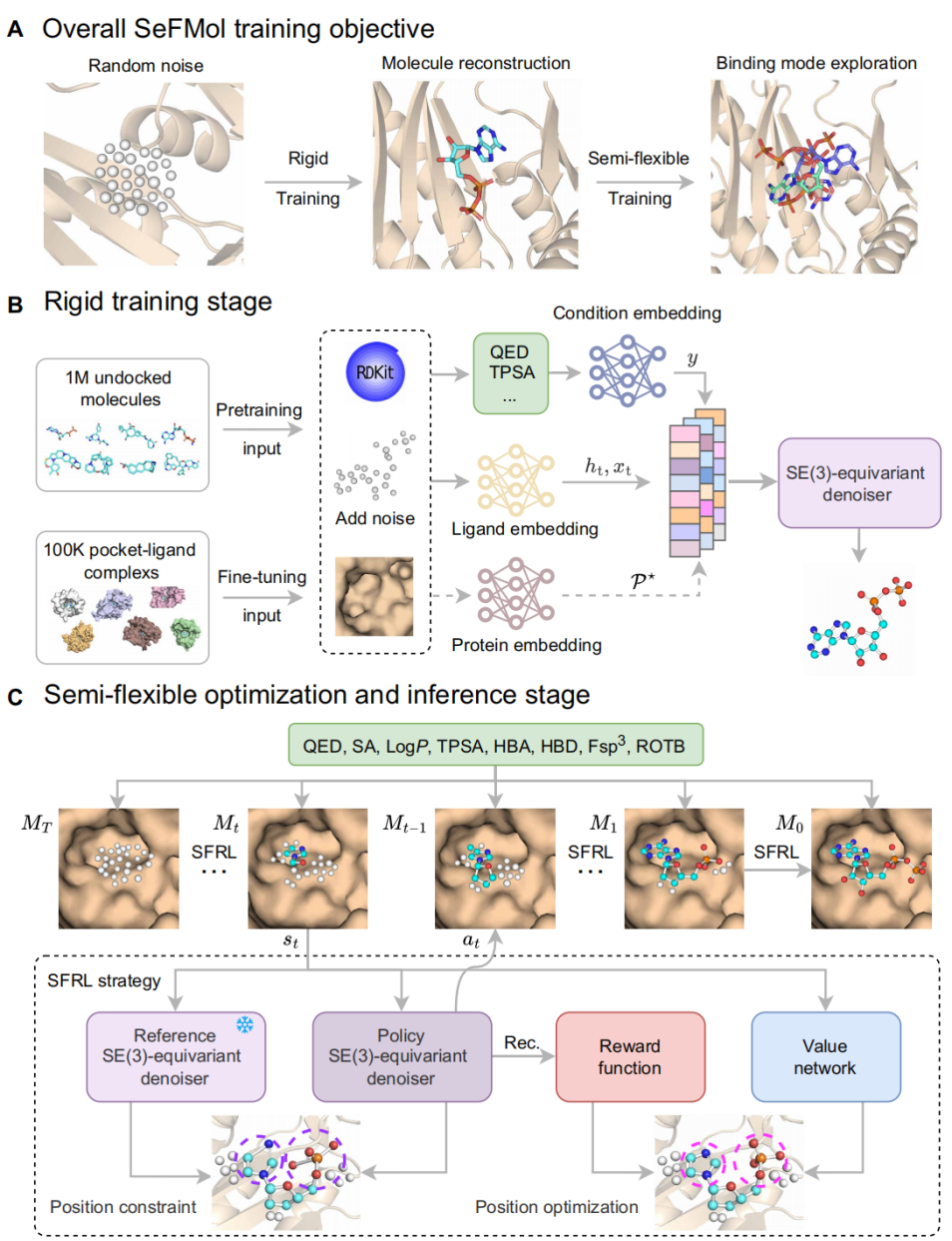 该研究提出了一种强化学习引导的半柔性分子扩散模型 SeFMol(Semi-Flexible Molecular Diffusion Model)。通过将扩散模型的去噪过程重新表述为马尔可夫决策过程,并利用强化学习在生成过程中隐式地动态调整分子构象,使配体能够以半柔性的方式更好地适应蛋白口袋。与此同时,SeFMol 还引入多种分子性质作为条件信号,并结合大规模无靶点分子预训练、蛋白-配体复合物微调以及快速采样策略,在提升结合能力的同时兼顾药物样性、化学合理性与采样效率。实验结果表明,SeFMol 在结合亲和力、成功率、性质控制、构象可靠性以及真实靶点泛化等方面优于现有方法,展示出较强的基于结构药物设计的潜力。该研究的相关数据和源代码均已经完全开源。