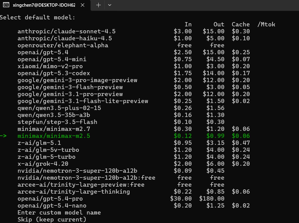 选择一个默认模型(如 gpt-4o, claude-3-5) 我选择一个便宜的minimax-m2.5
