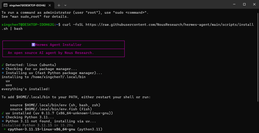 curl -fsSL https://raw.githubusercontent.com/NousResearch/hermes-agent/main/scripts/install.sh | bash