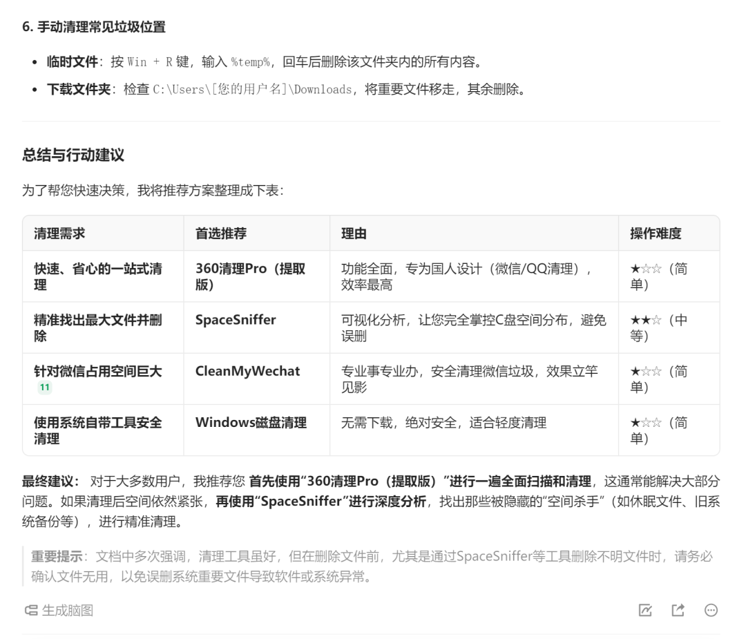 比如,你急需清理C盘时问问我的这个ima知识库,它在给你罗列出一系列工具后,会给出一份总结与行动建议。