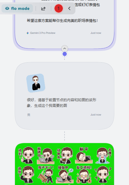 2. 再把这段描述接到下一个节点,用 Nano Pro 直接出图(5×5 网格)。这样下来的工作流模式,能让表情包细节更稳定、动作更丰富,而且出来的成品能更有微信表情包那味儿。