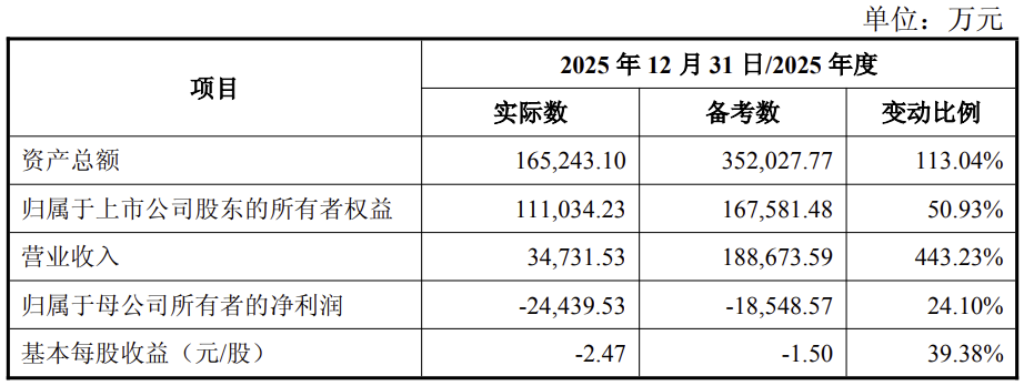 在资产规模方面,公司资产总额从实际的16.52亿元扩大至备考的35.20亿元,增长113.04%;归属于母公司股东的所有者权益从11.10亿元增至16.76亿元,增长50.93%。基本每股收益也从每股亏损2.47元改善至每股亏损1.50元,亏损幅度收窄39.38%。