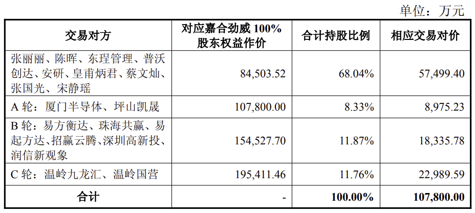 嘉合劲威创始团队及早期股东(包括张丽丽、陈晖、东珵管理、普沃创达等9名股东)合计持股68.04%,其对应的嘉合劲威100%股权作价为8.45亿元,相应交易对价约为5.75亿元。
