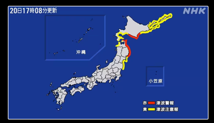 气象厅预紧急针对北海道太平洋沿岸中部、青森县太平洋沿岸以及岩手县发布“海啸警报”,预计浪高3米。同时,也针对北海道太平洋沿岸东部;北海道太平洋沿岸西部;福岛县;青森县日本海沿岸等地发布了“海啸注意”,预计浪高1米。