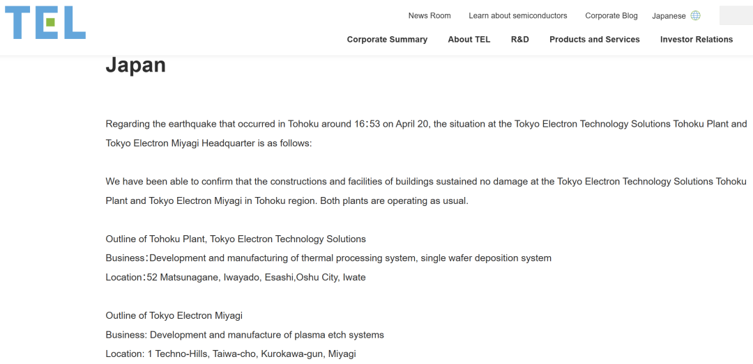 其中,TEL官网的最新公告称,经确认,位于东北地区的东京电子技术解决方案东北工厂和东京电子宫城总部的建筑物和设施均未受损。两家工厂均正常运营。这也证实了此前相关停产/停运报道是假消息。