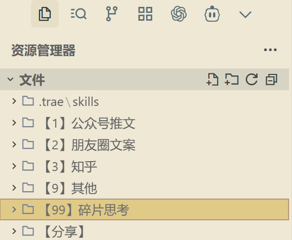 个人信息详细版.md和目标用户画像.md。这里面写清楚了我是 Dawson、我是 ISFJ 人格、我是做职场提效的。这是所有内容生成的源头,AI 读了它,才知道该用什么语气说话。【1】公众号推文、【3】知乎、【99】碎片思考等文件夹。碎片思考里记一笔;公众号推文文件夹。.trae/skills目录,把公众号写作、知乎回答、小红书文案等不同能力,封装成一个个独立的 Skill。有了这个架构,AI 就不再是瞎编乱造,而是在你设定好的框架里执行任务,精准度直接提升 200%。