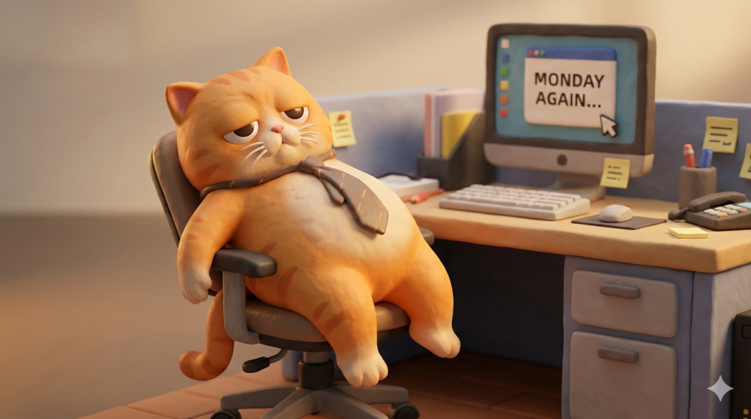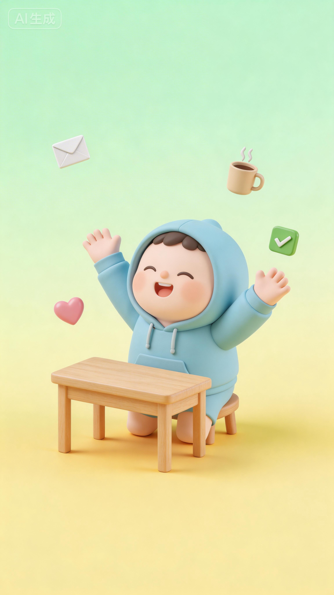 【画面描述】:一个可爱的 3D 卡通小人(类似 Pop Mart 风格),坐在大大的电脑屏幕前伸懒腰,周围漂浮着邮件、爱心、咖啡杯等 3D 图标。背景是柔和的马卡龙色系。