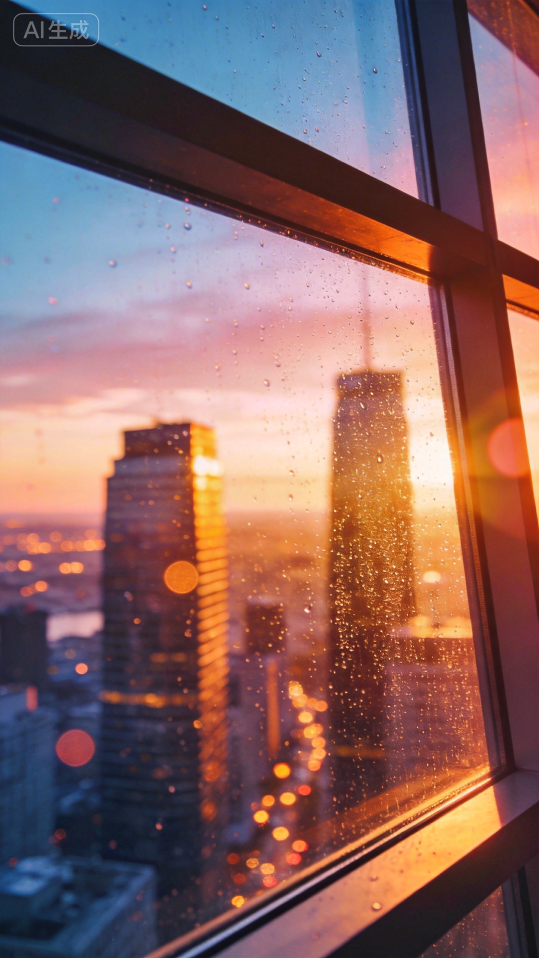 【画面描述】:从高层写字楼的窗户向外看,城市刚刚苏醒,远处的地平线泛着金光,近处的玻璃上有淡淡的露珠或倒影。