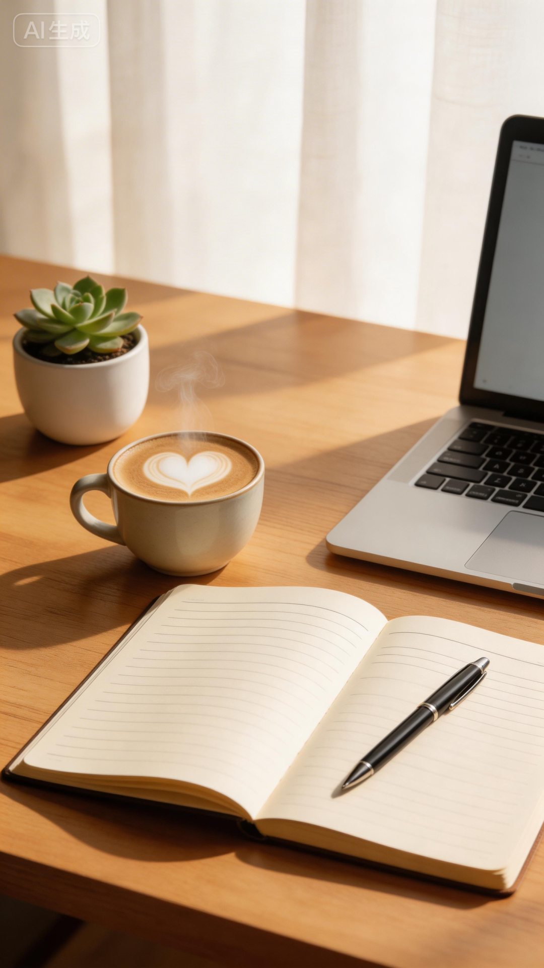 【画面描述】:清晨的阳光洒在原木色书桌上,一杯冒着热气的咖啡,一盆生机勃勃的小多肉,笔记本电脑旁放着一本打开的书。光影斑驳,氛围宁静。