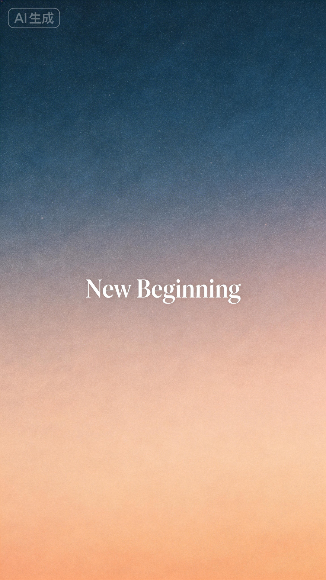 【画面描述】:极简的抽象渐变色背景,从深蓝过渡到温暖的橙色(象征黎明),中间有一行极小的白色文字 "New Beginning"。