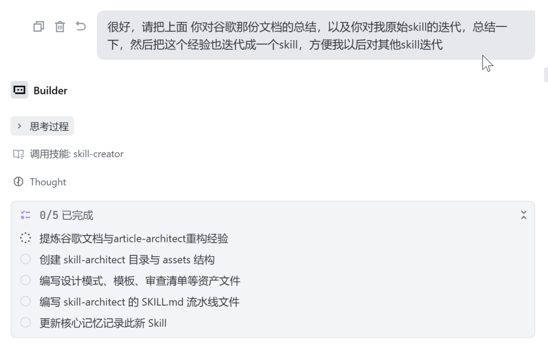 但这还不够。跑通这套逻辑后,我直接用魔法打败魔法,手搓了一个名为skill-architect的首席架构师技能!