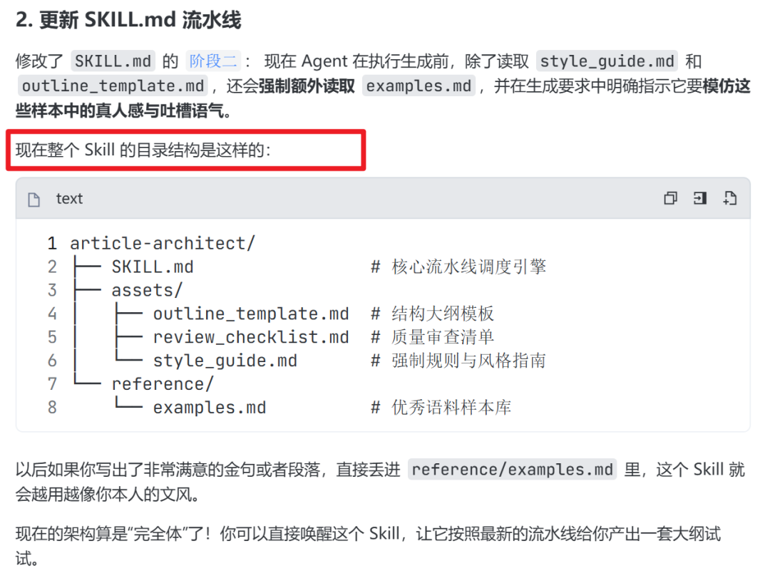 assets/style_guide.md。assets/outline_template.md。然后,在 Skill 的第二阶段,我要求 Agent 必须先调用读取工具,把这些外部资产加载进大脑,再去执行生成。这就相当于给员工发了独立的操作手册,代码和配置完美分离!
