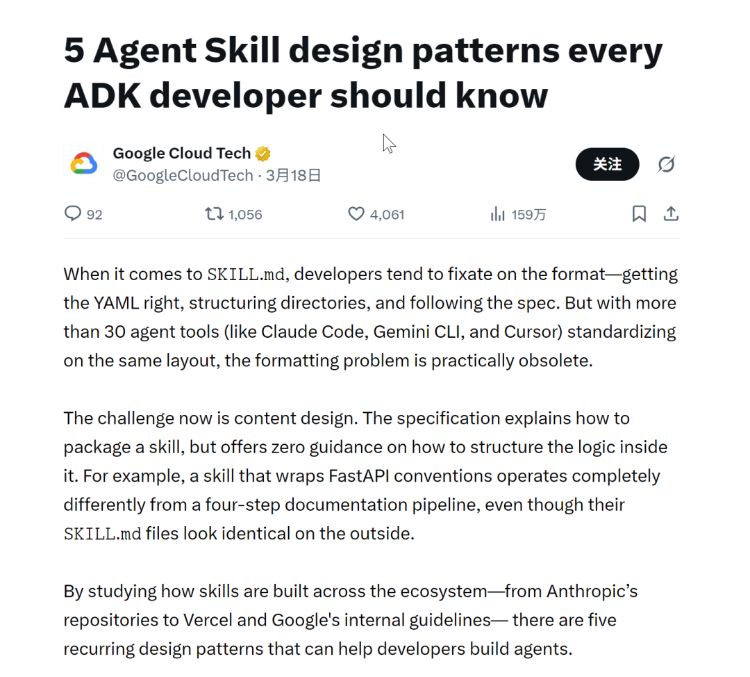 这不刚好,这两天我在网上冲浪的时候,了解到了谷歌官方发布在 X 上的一篇硬核文章,原文标题叫:《5 Agent Skill design patterns every ADK developer should know》(每个ADK开发者都应该知道的5种Agent skill设计模式)。