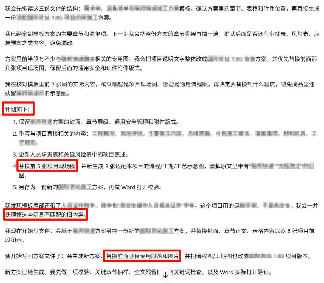 这个任务最有代表性的地方在于,它不是单纯处理一个 Word,而是要同时理解docx + xlsx + 既有模板,还得判断哪些内容该保留,哪些章节该重写,模板里的哪些图片和附件已经不适用了。