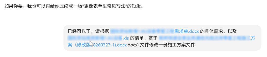不是从 0 编一篇文章,而是基于需求单和设备清单,把旧模板改造成一份新的施工方案。