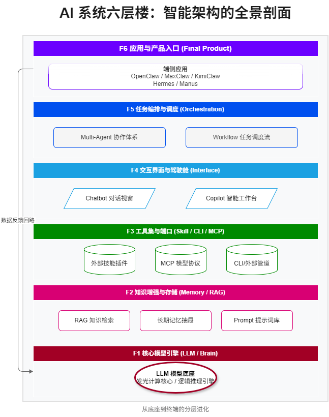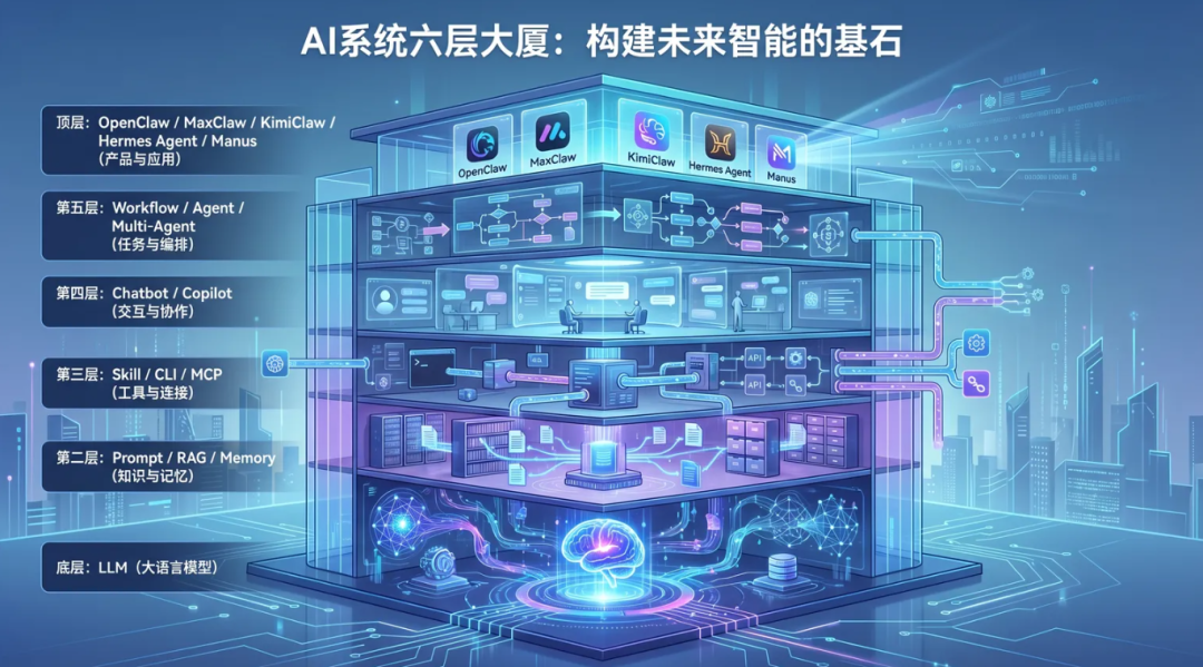 Hermes、Openclaw还是别的名字,那是第六层。你看,到这里这些词就不再像黑话了。