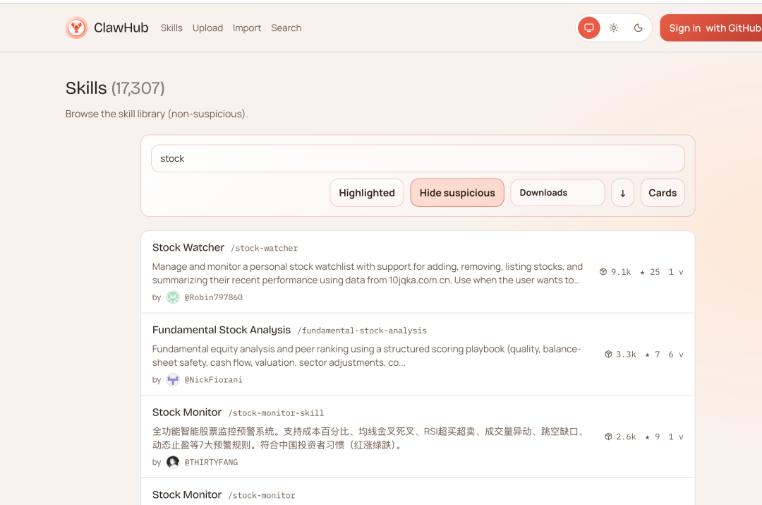 遵循“拿来主义”的原则,我们直接选择 Star 数排名靠前的项目。例如,这里有一个非常经典的技能:Robin797860/stock-watcher